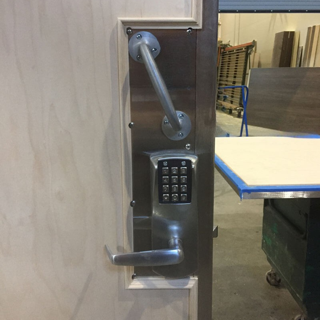 Get customized doors (solid wood, custom veneer, specialty blowout) with left and right-hand swing options, including diverse hardware, locking mechanisms, and various window inserts for optimal security and access control.